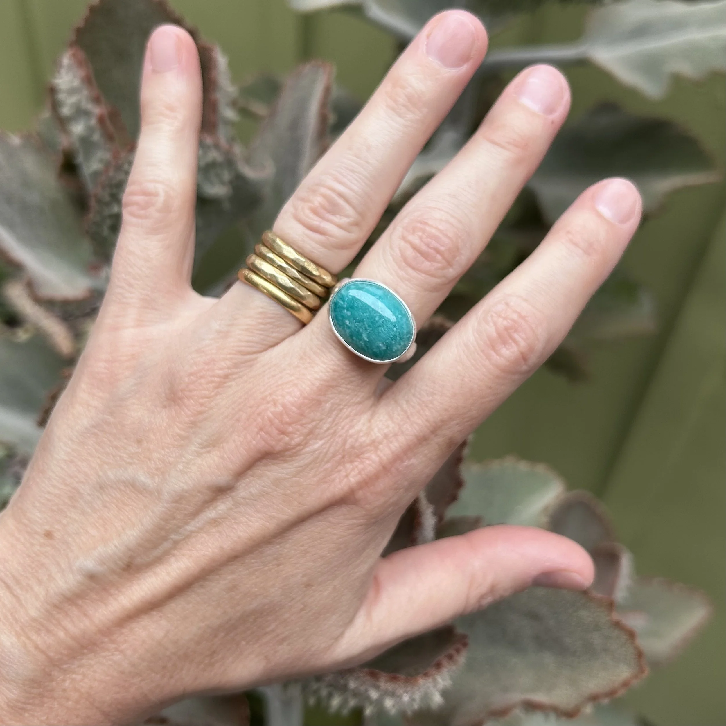 An electric, sparkly Amazonite cabochon set in .925 and fine sterling silver, atop a simple hammered sterling band. Stone measures approx. 1.8 × 1.5cm., fits like an 8.5.